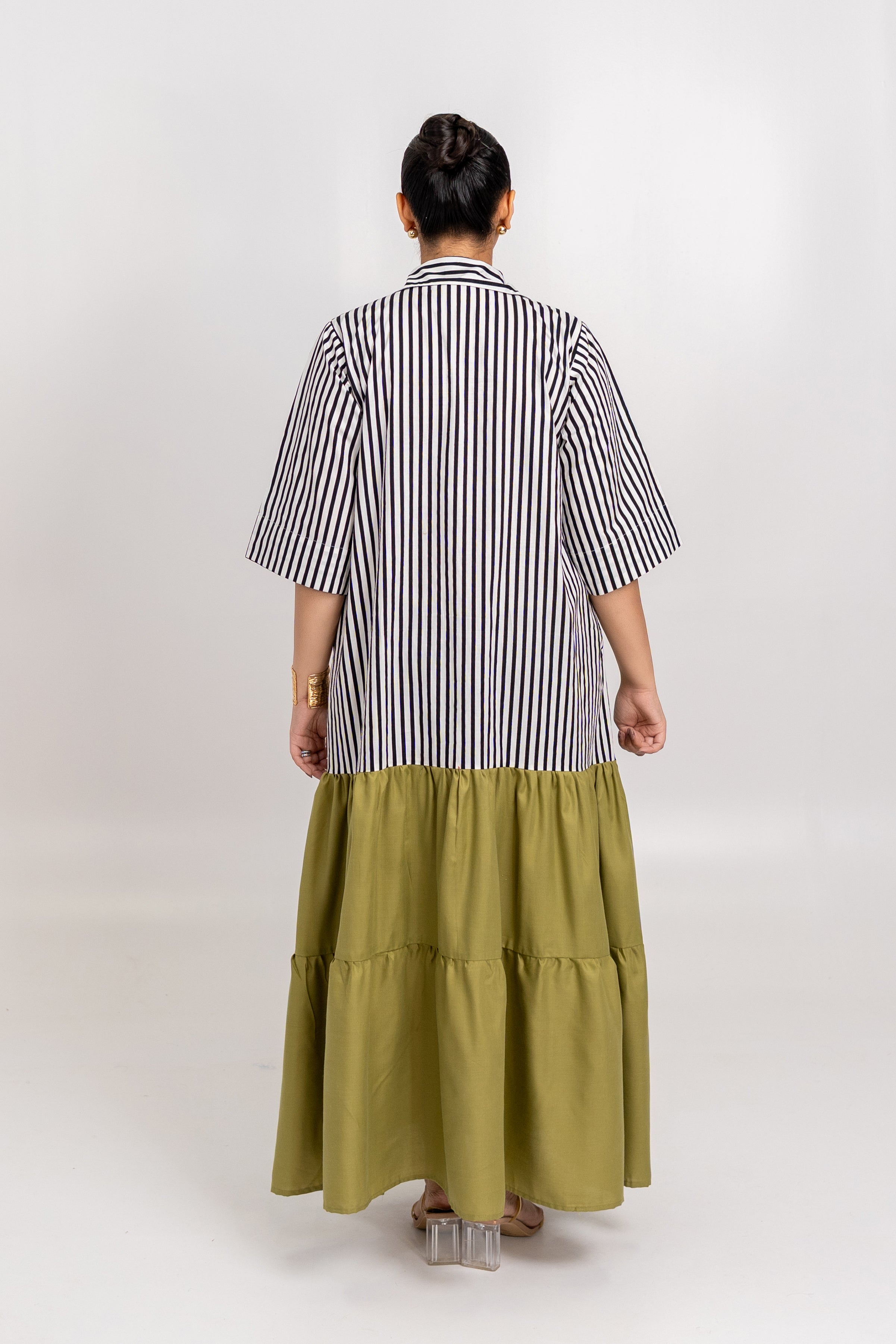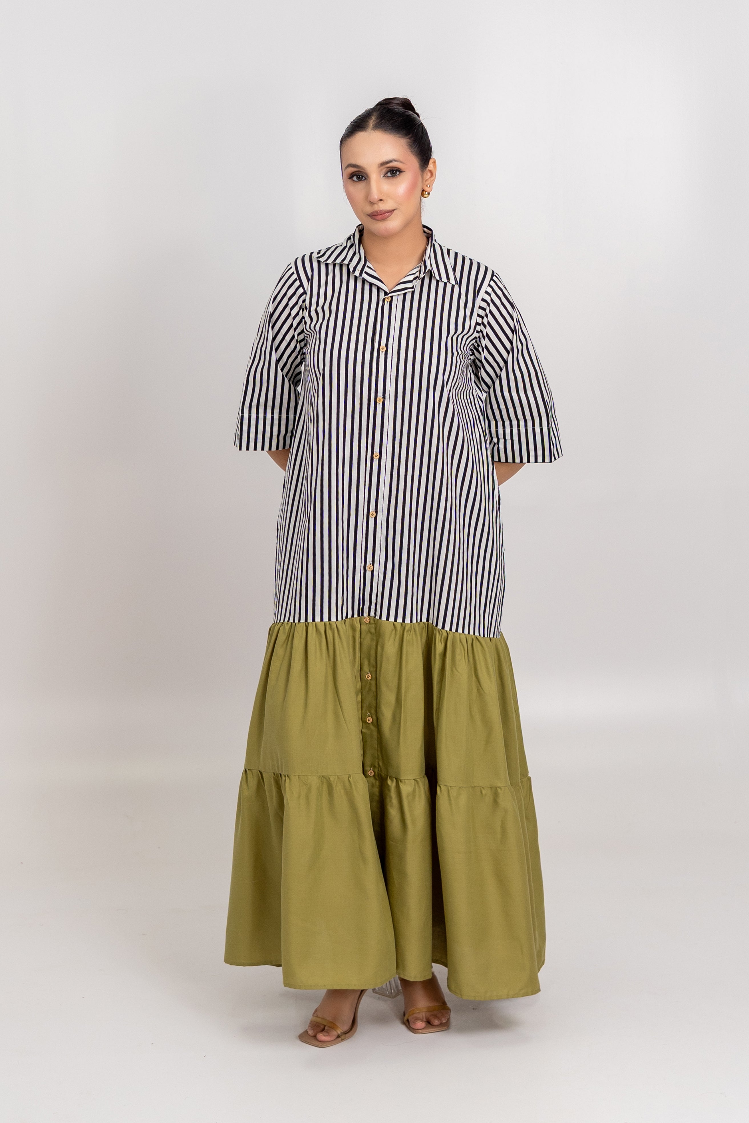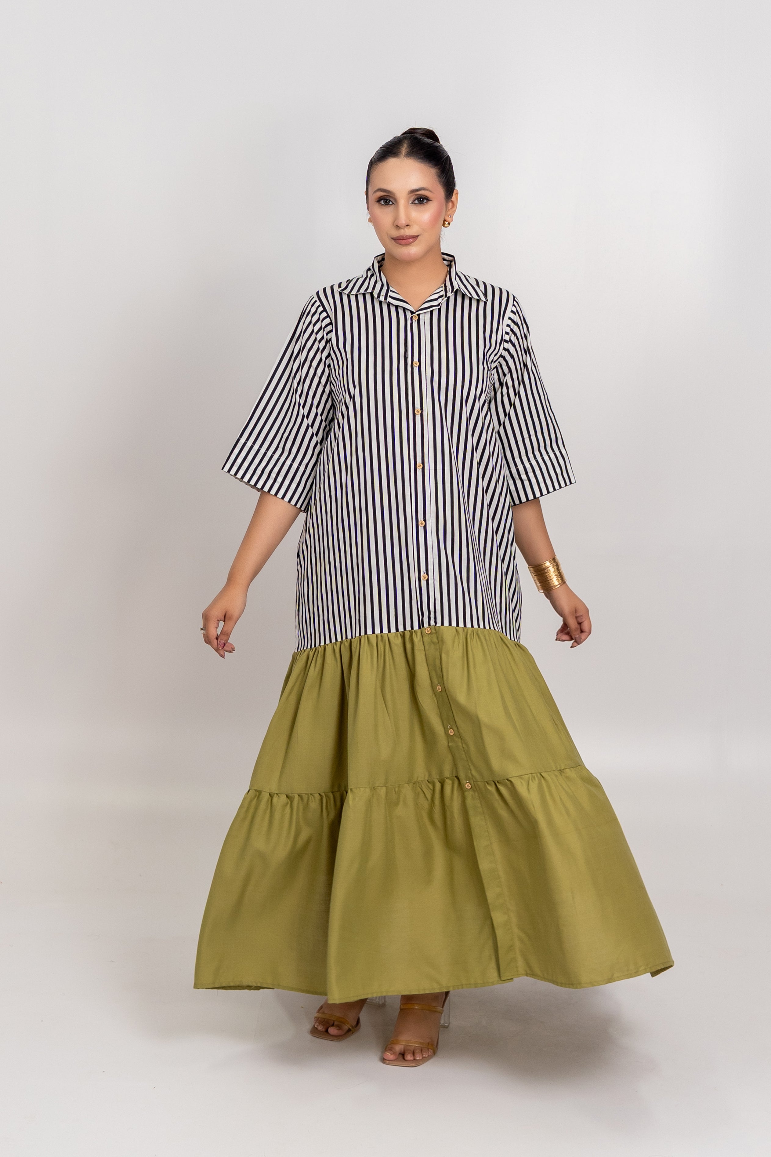 Chic and effortlessly stylish, this maxi dress combines bold stripes with earthy tones for a modern statement look. The top features a classic black-and-white vertical stripe shirt design with a button-down front and collared neckline, offering a structured yet relaxed fit. The half sleeves are slightly flared for ease and comfort. The dress flows into a tiered olive green skirt, crafted from soft breathable fabric, adding volume and movement with every step. Side pockets bring both practicality and charm, making it perfect for day-to-day wear or casual outings.