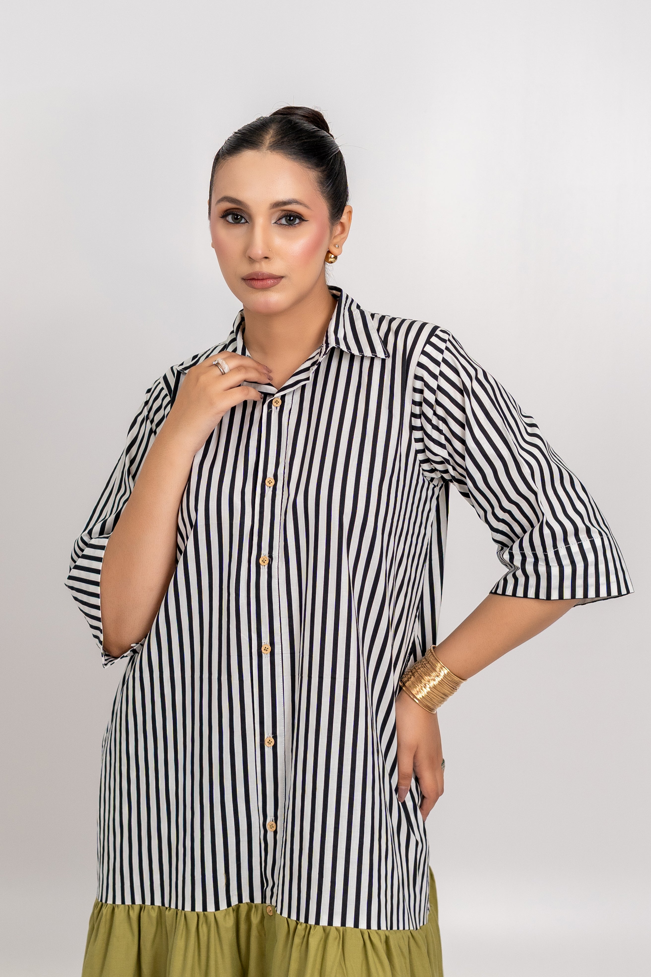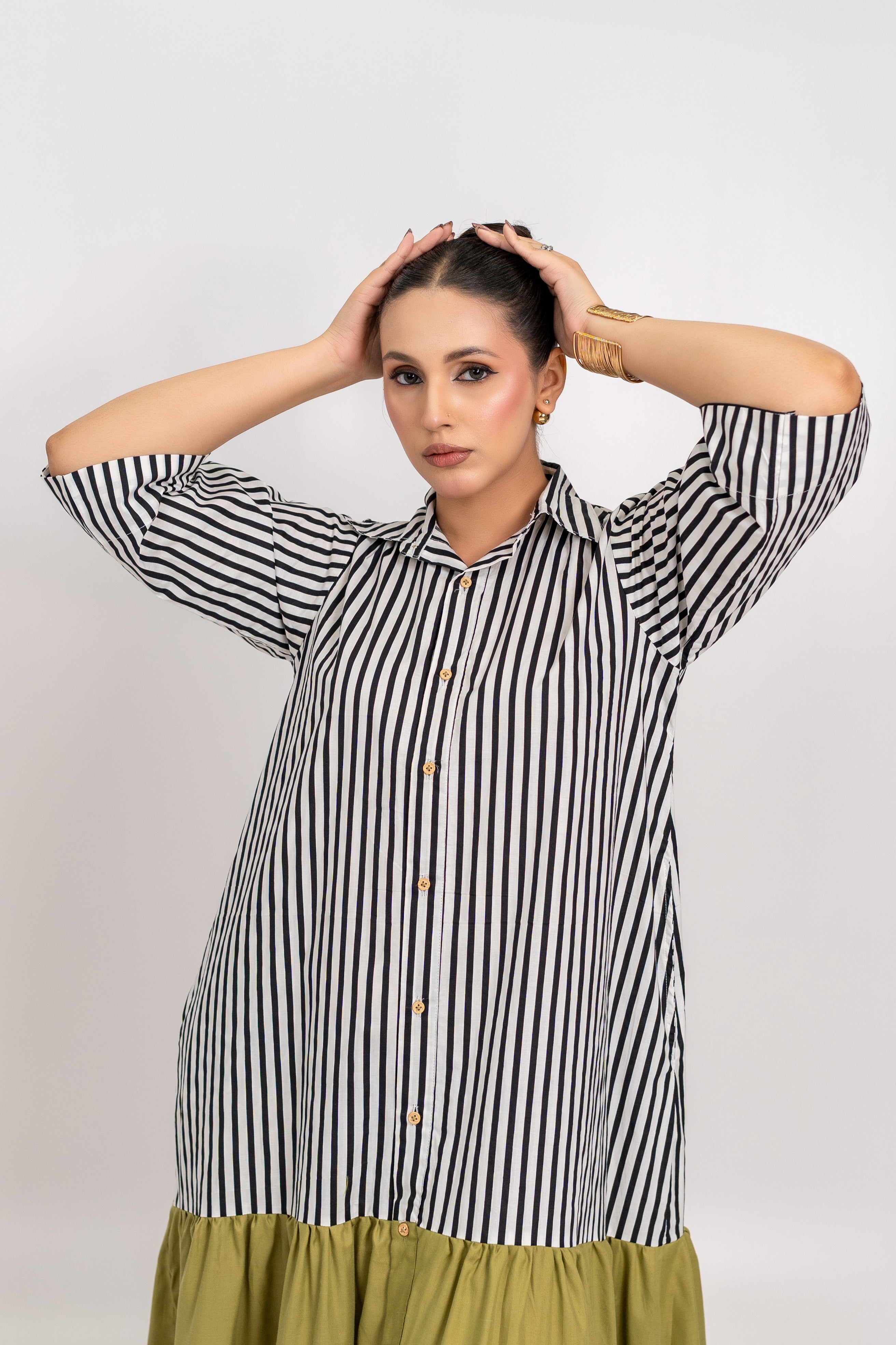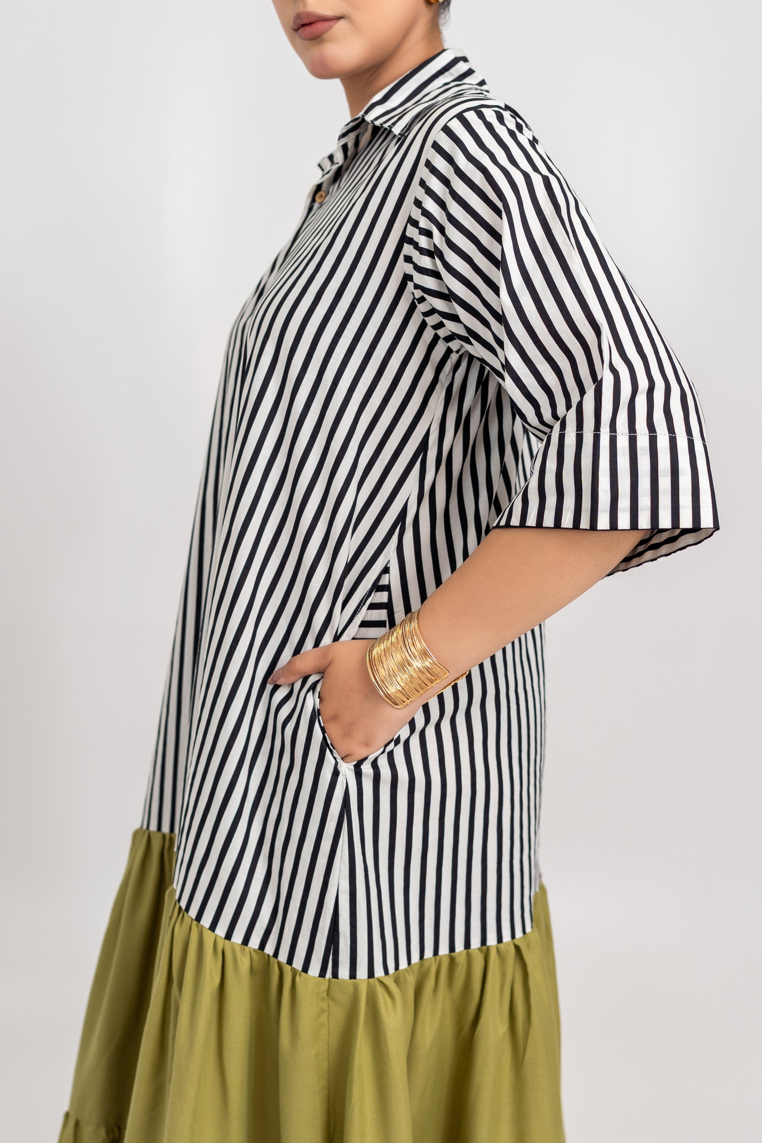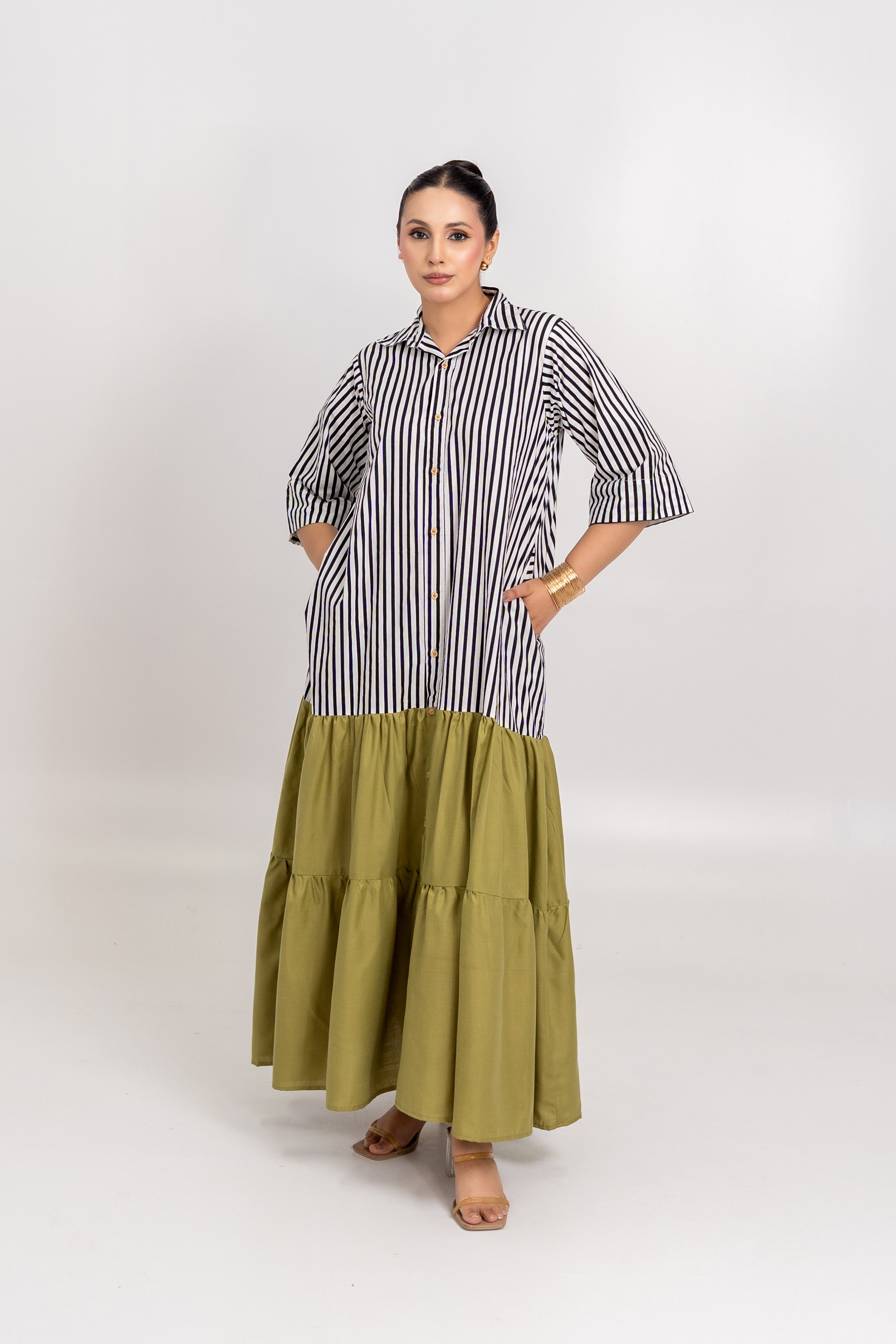 Chic and effortlessly stylish, this maxi dress combines bold stripes with earthy tones for a modern statement look. The top features a classic black-and-white vertical stripe shirt design with a button-down front and collared neckline, offering a structured yet relaxed fit. The half sleeves are slightly flared for ease and comfort. The dress flows into a tiered olive green skirt, crafted from soft breathable fabric, adding volume and movement with every step. Side pockets bring both practicality and charm, making it perfect for day-to-day wear or casual outings.