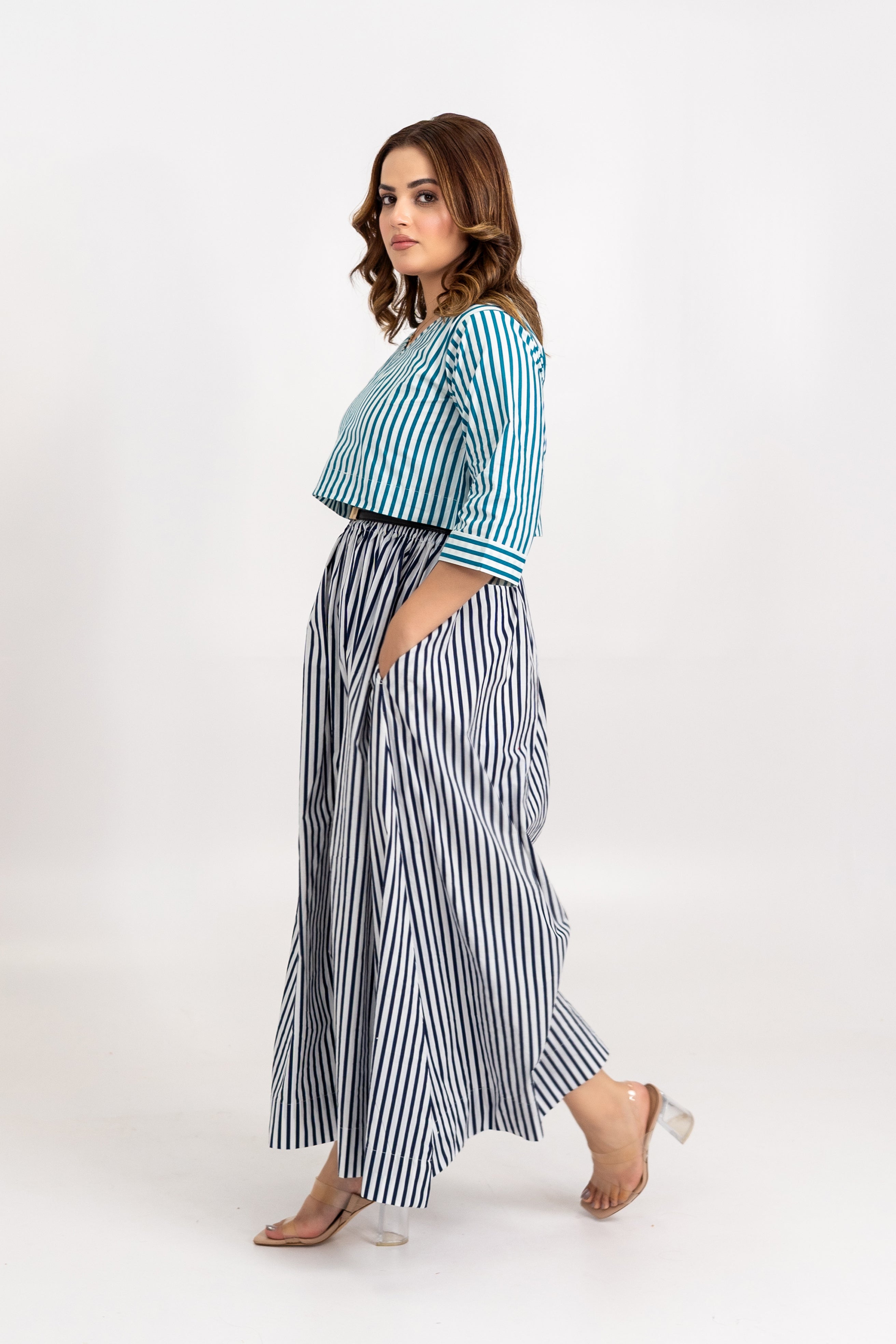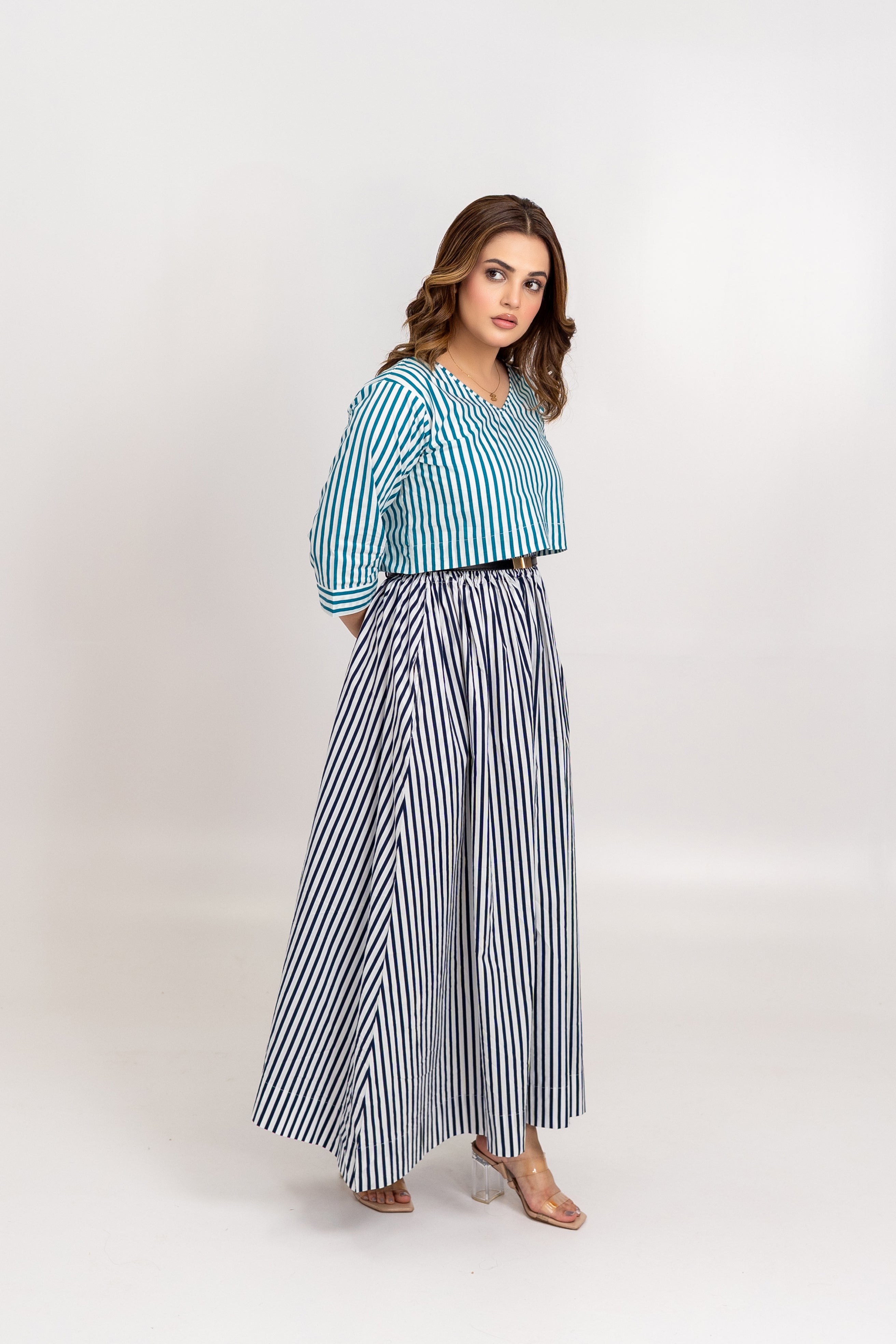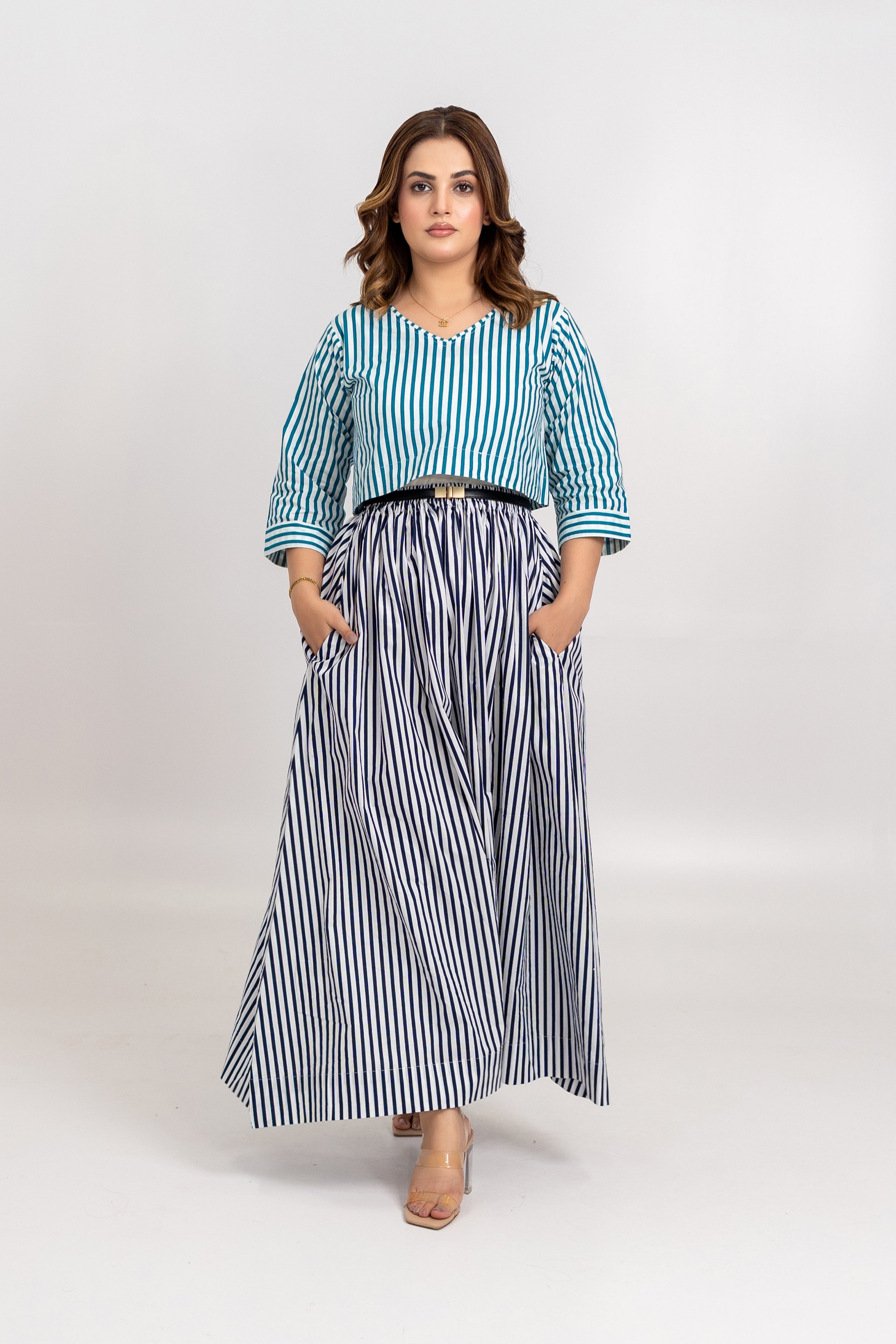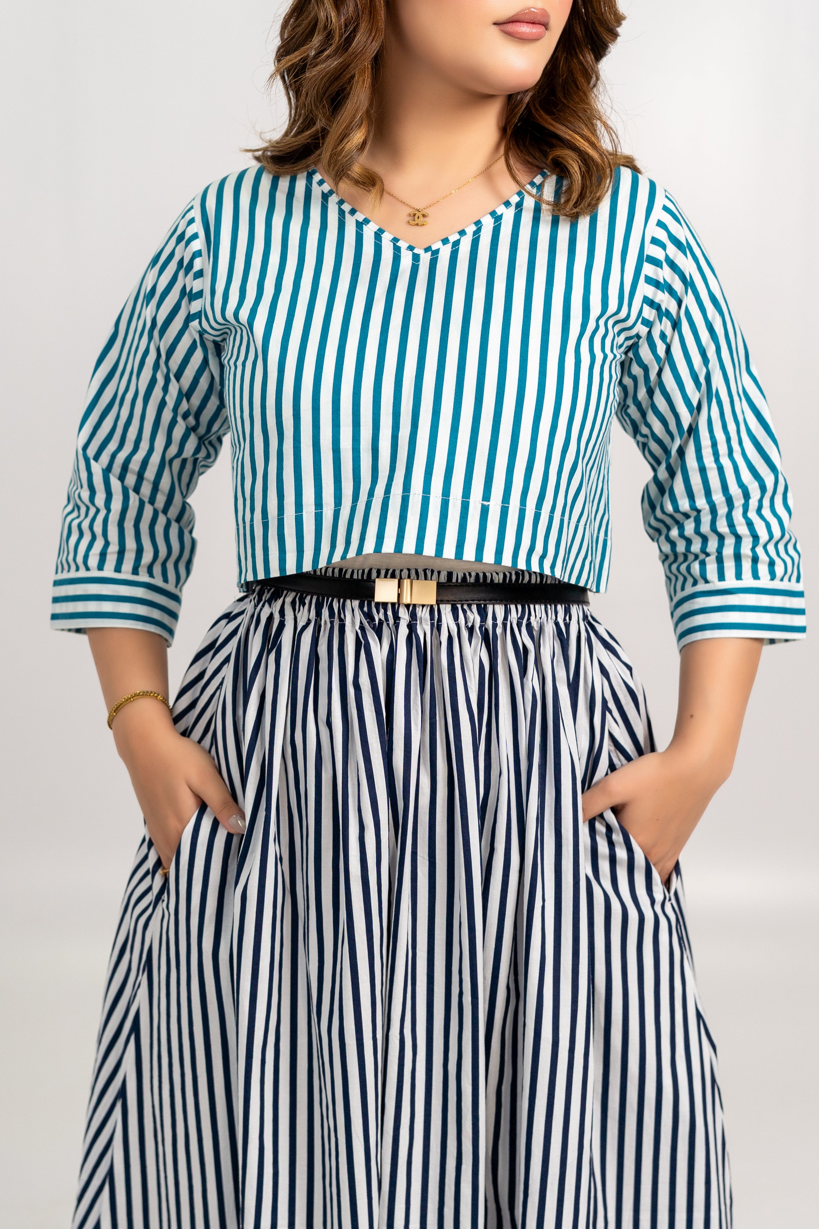 Playful yet effortlessly chic, this striped two-piece set is crafted from soft breathable cotton for all-day comfort. The teal and white striped crop top features a relaxed fit with three-quarter sleeves, while the high-waisted maxi skirt is designed with classic navy stripes for a striking contrast. Practical side pockets add everyday ease, and the flowing silhouette ensures graceful movement. Perfect for casual outings, vacation wear, or a stylish day-to-night look.