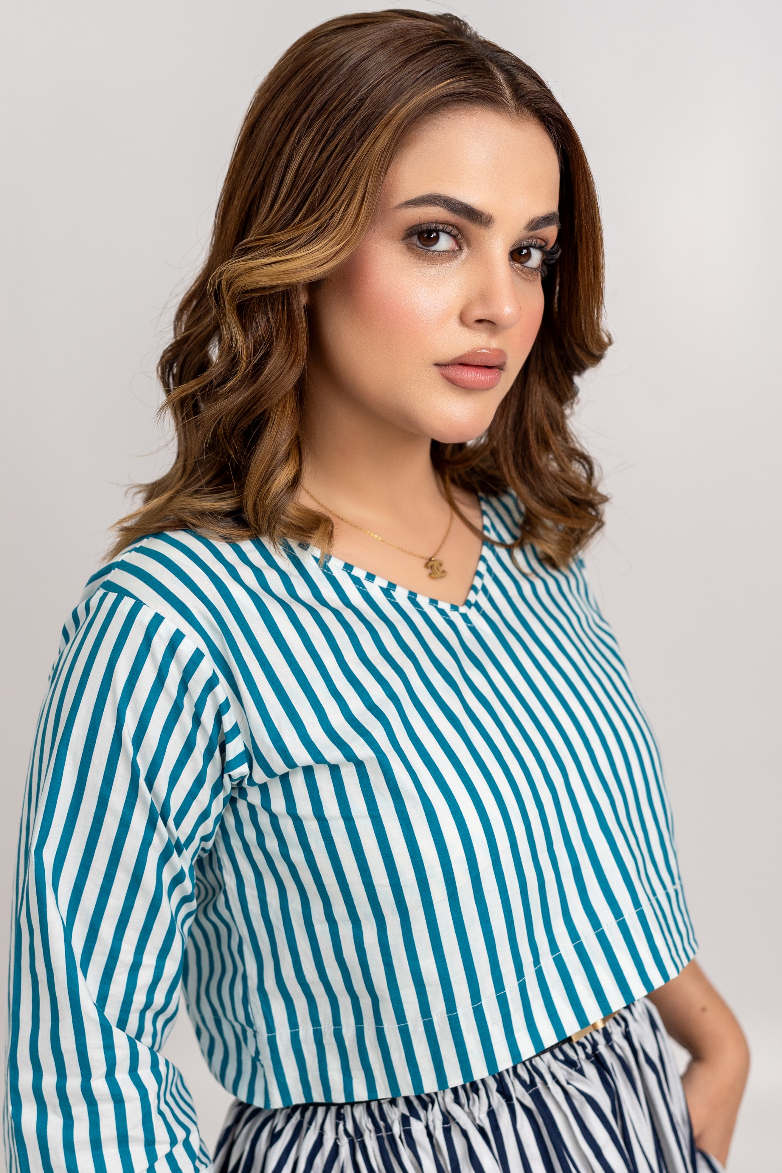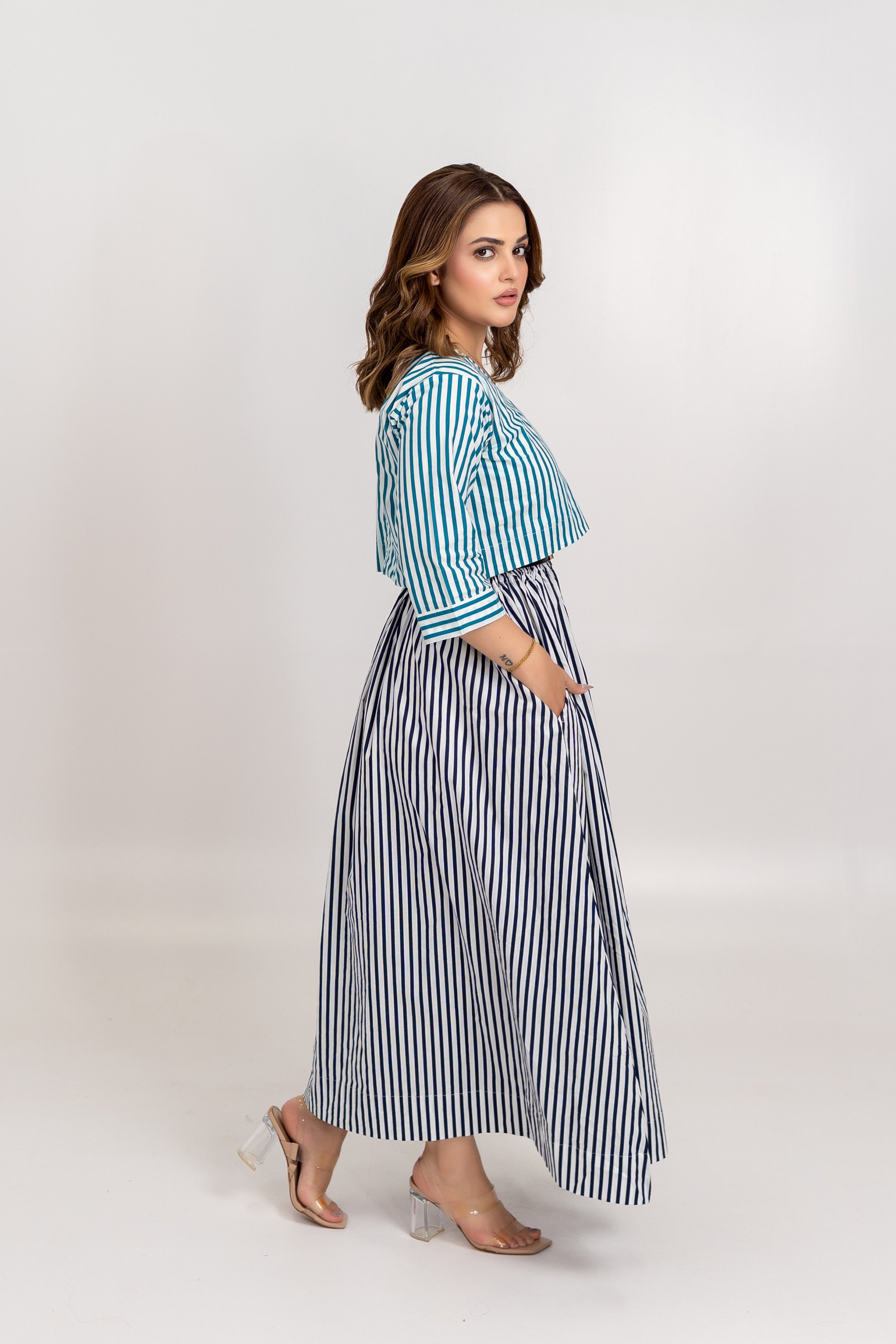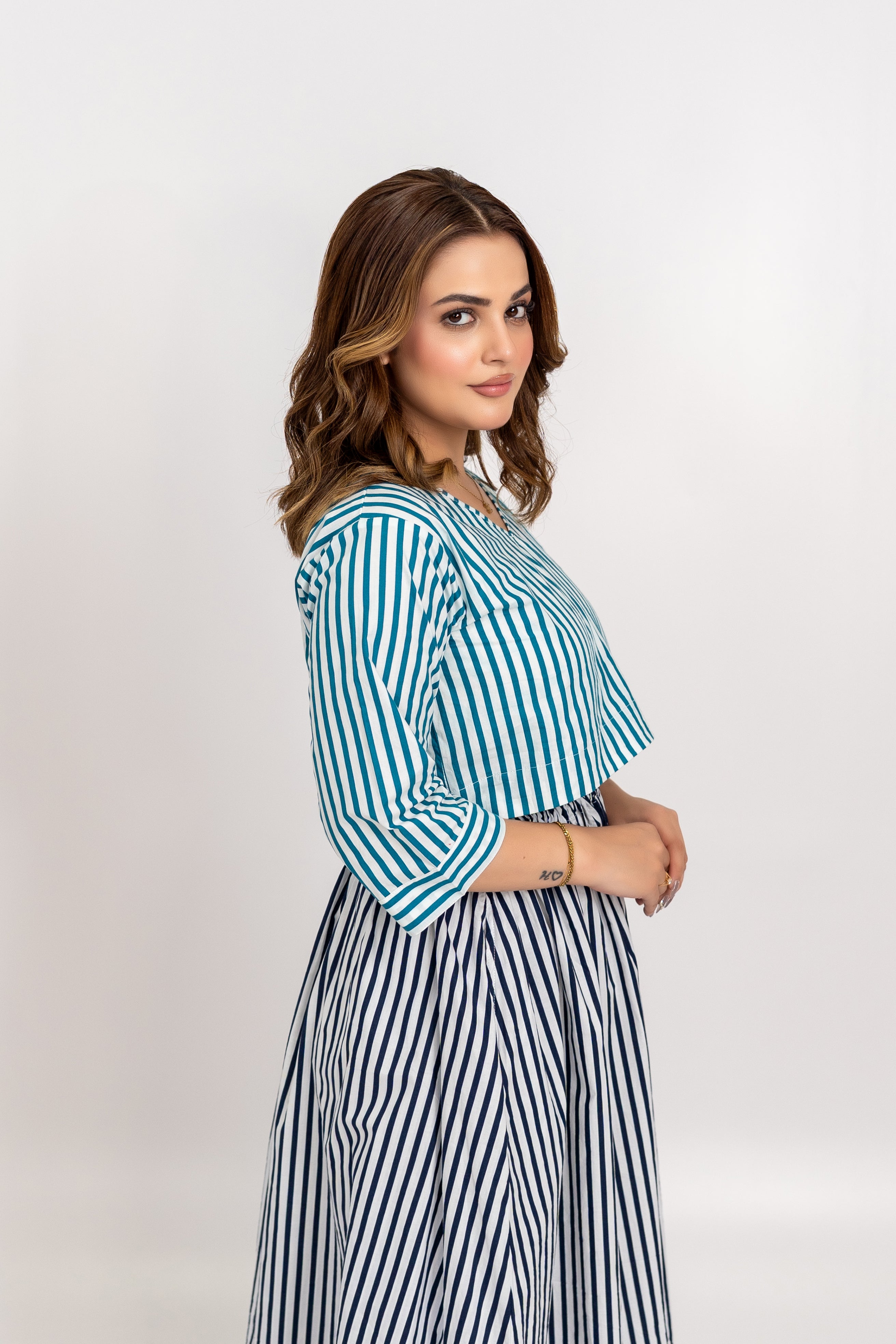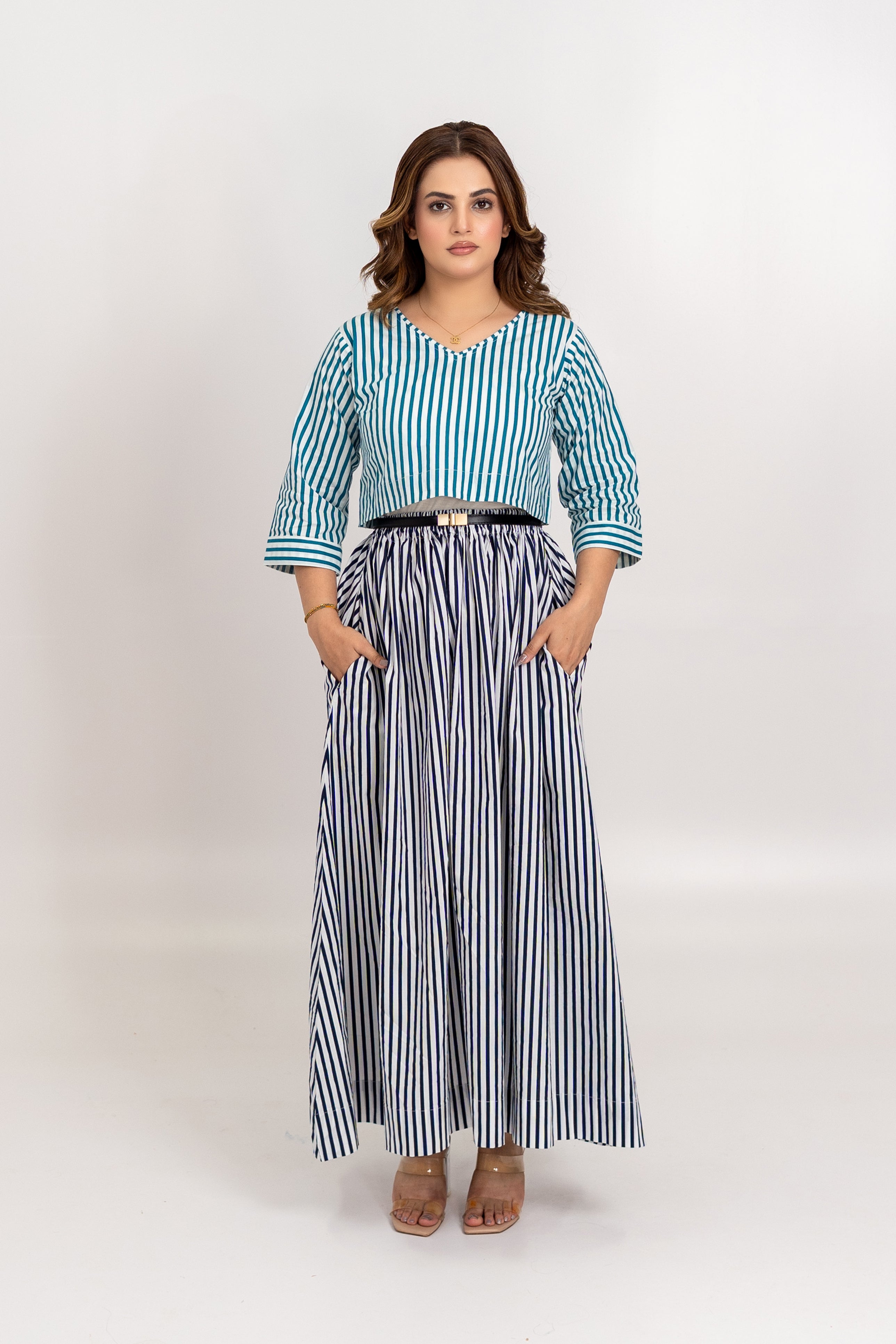 Playful yet effortlessly chic, this striped two-piece set is crafted from soft breathable cotton for all-day comfort. The teal and white striped crop top features a relaxed fit with three-quarter sleeves, while the high-waisted maxi skirt is designed with classic navy stripes for a striking contrast. Practical side pockets add everyday ease, and the flowing silhouette ensures graceful movement. Perfect for casual outings, vacation wear, or a stylish day-to-night look.