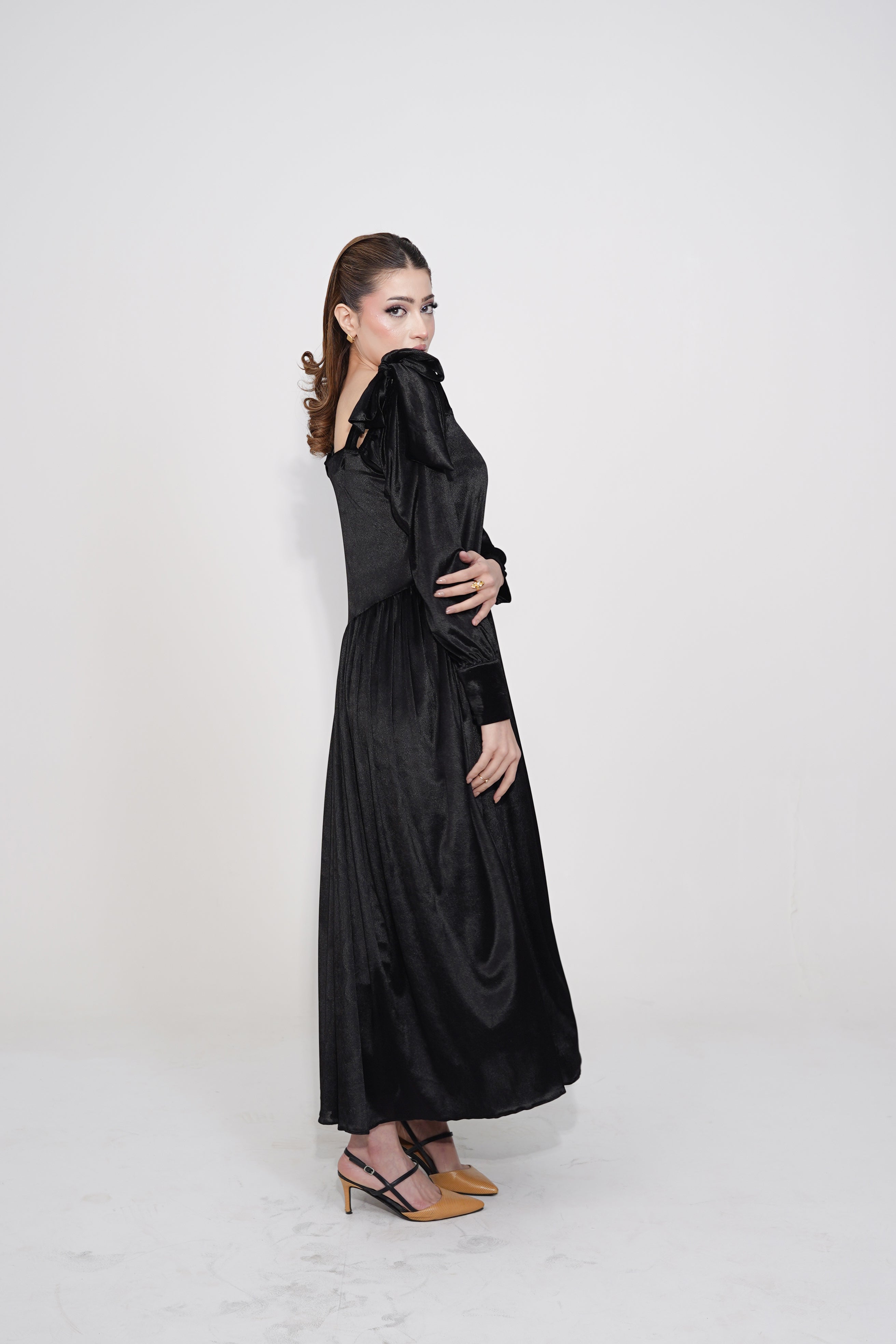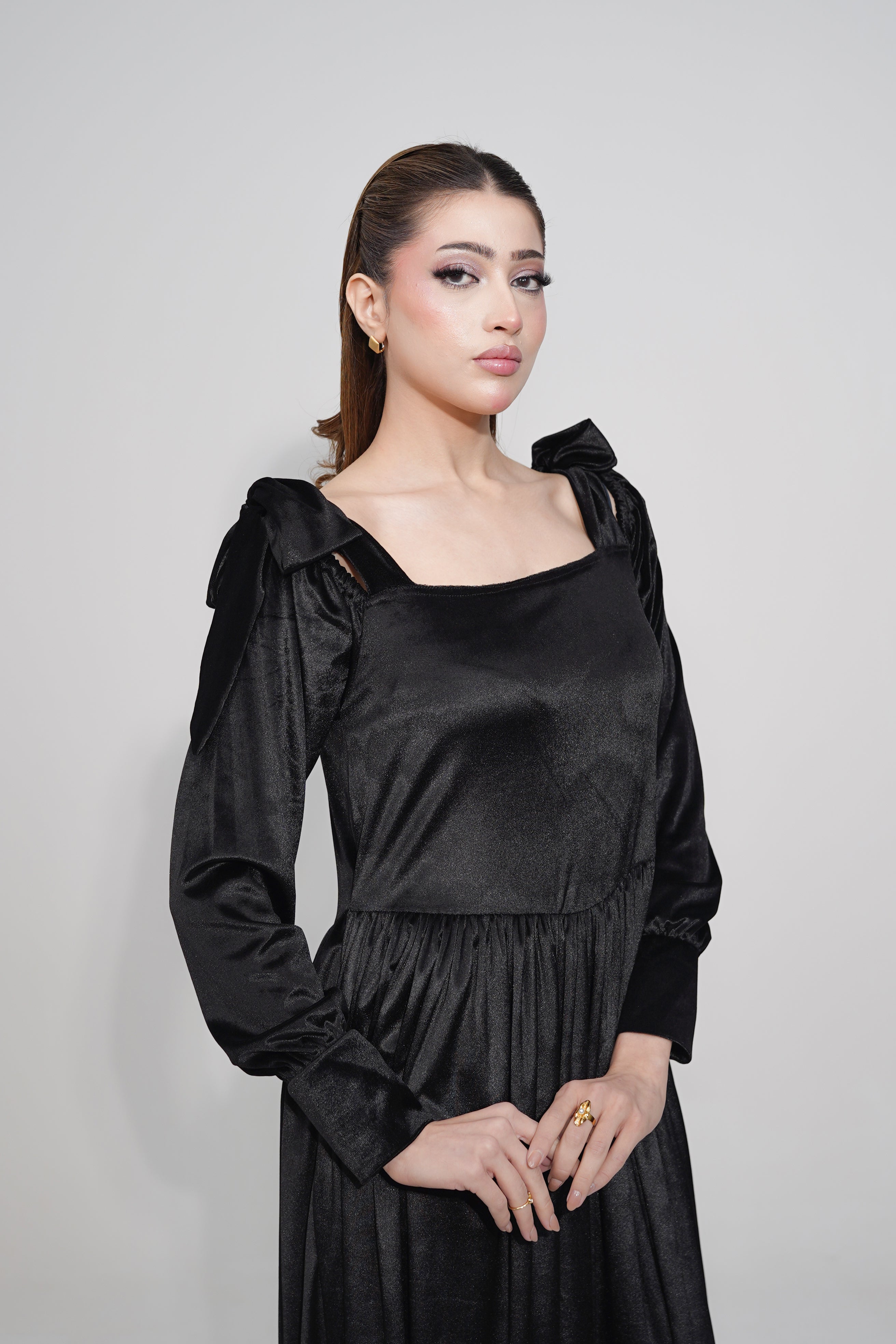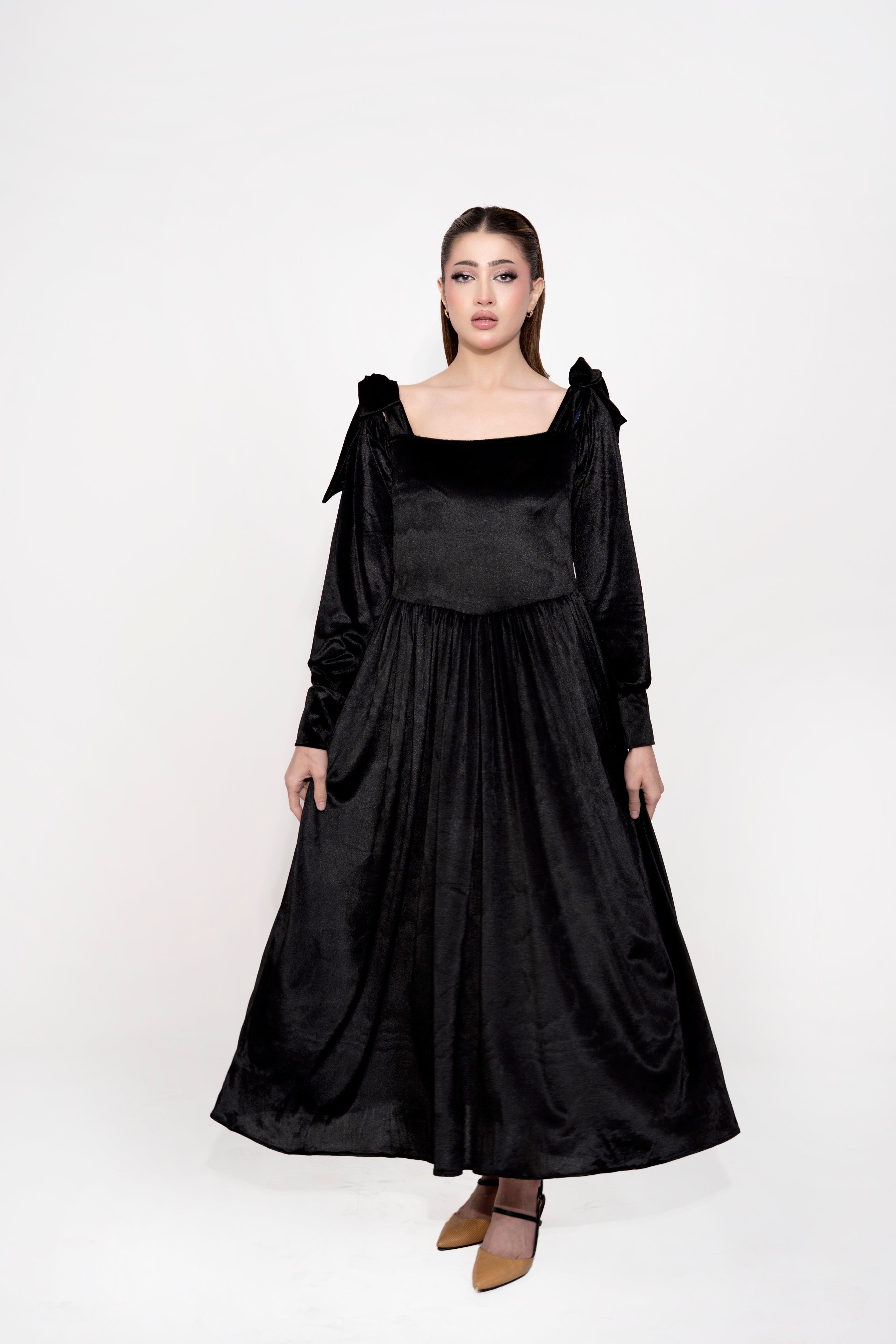 Featuring a structured square neckline, soft full sleeves, and adjustable velvet shoulder ties that can be styled into bows or left minimal—this piece allows you to customize your look with ease. The flowing A-line silhouette adds graceful movement, creating a romantic, elevated presence perfect for evenings out or special occasions.