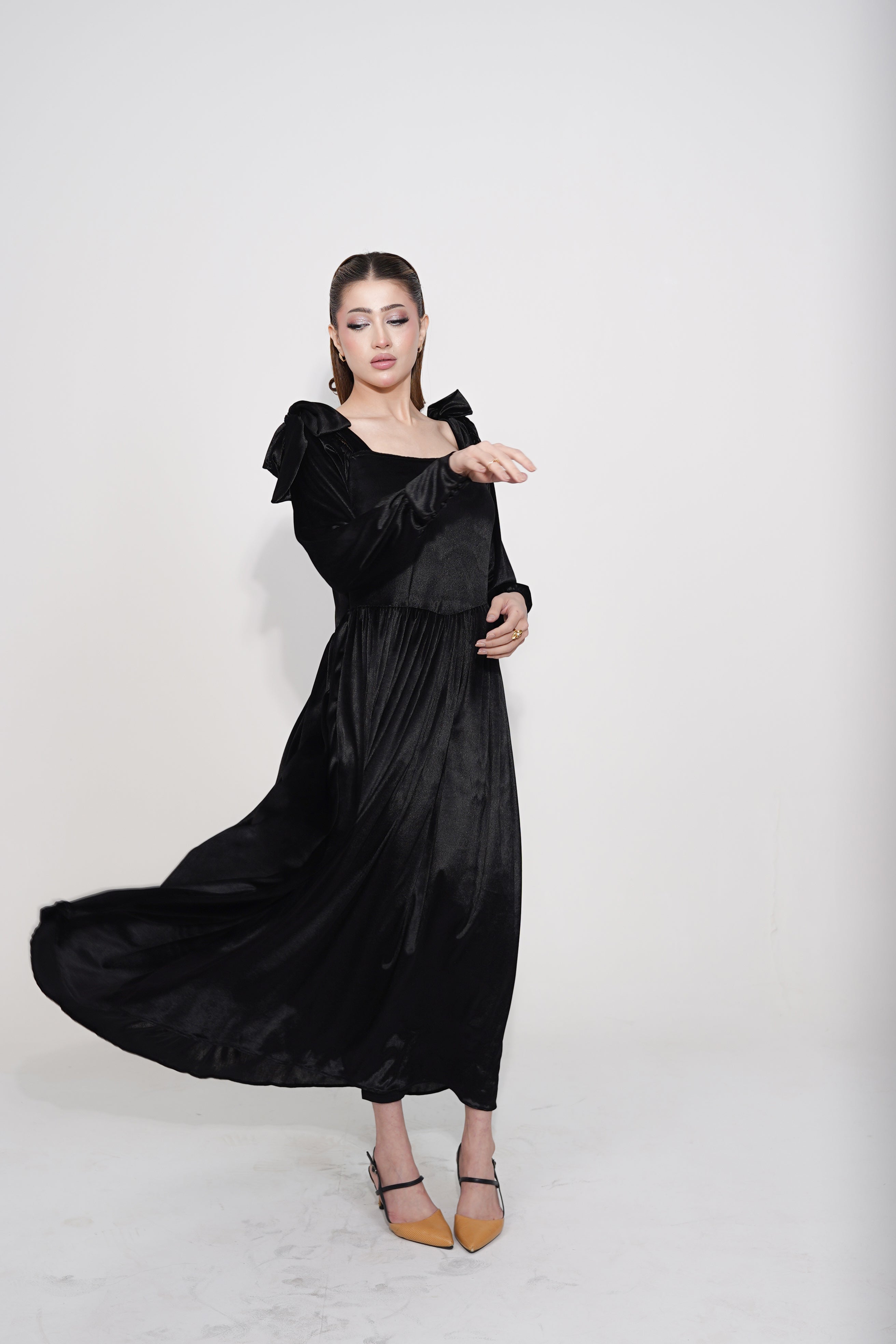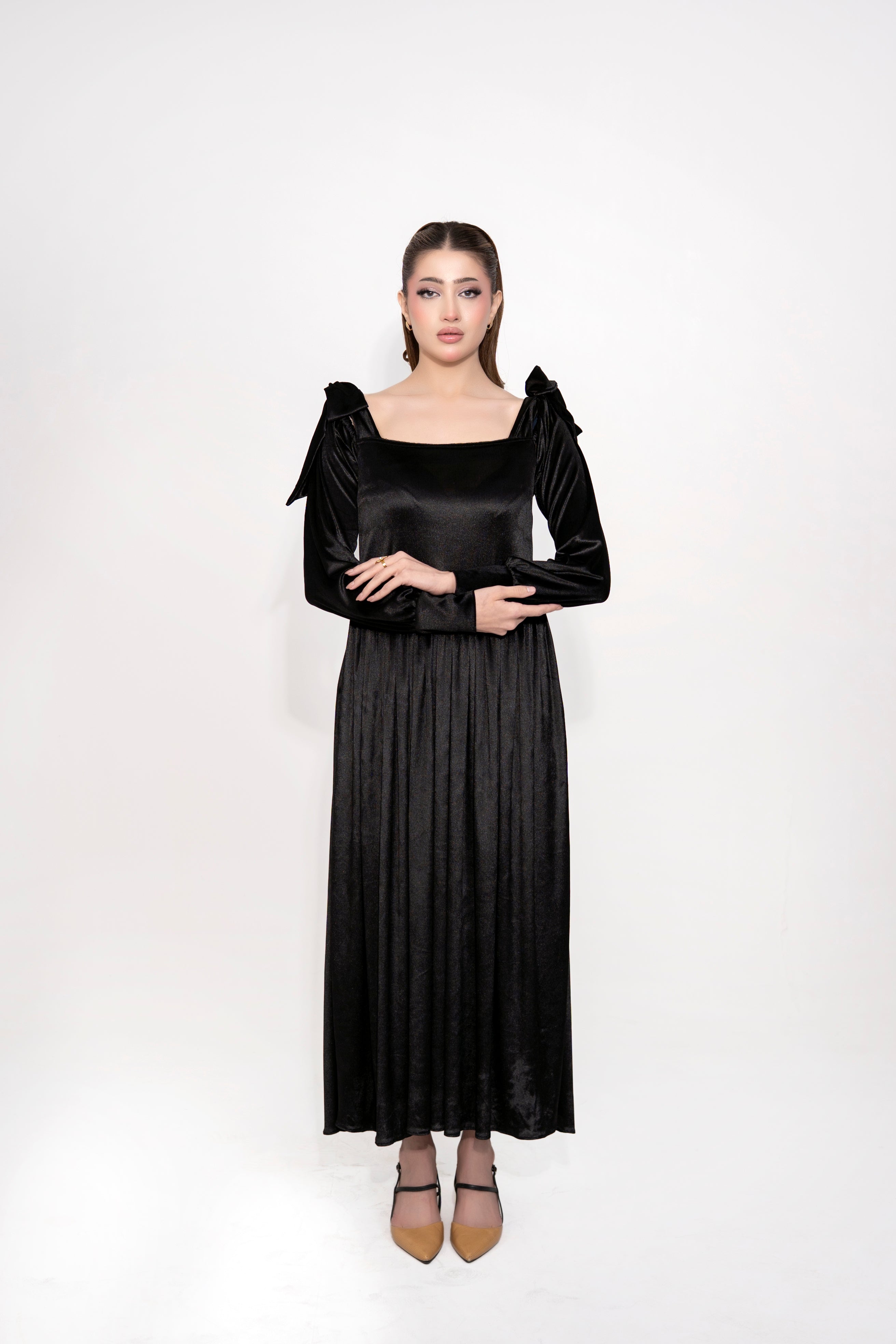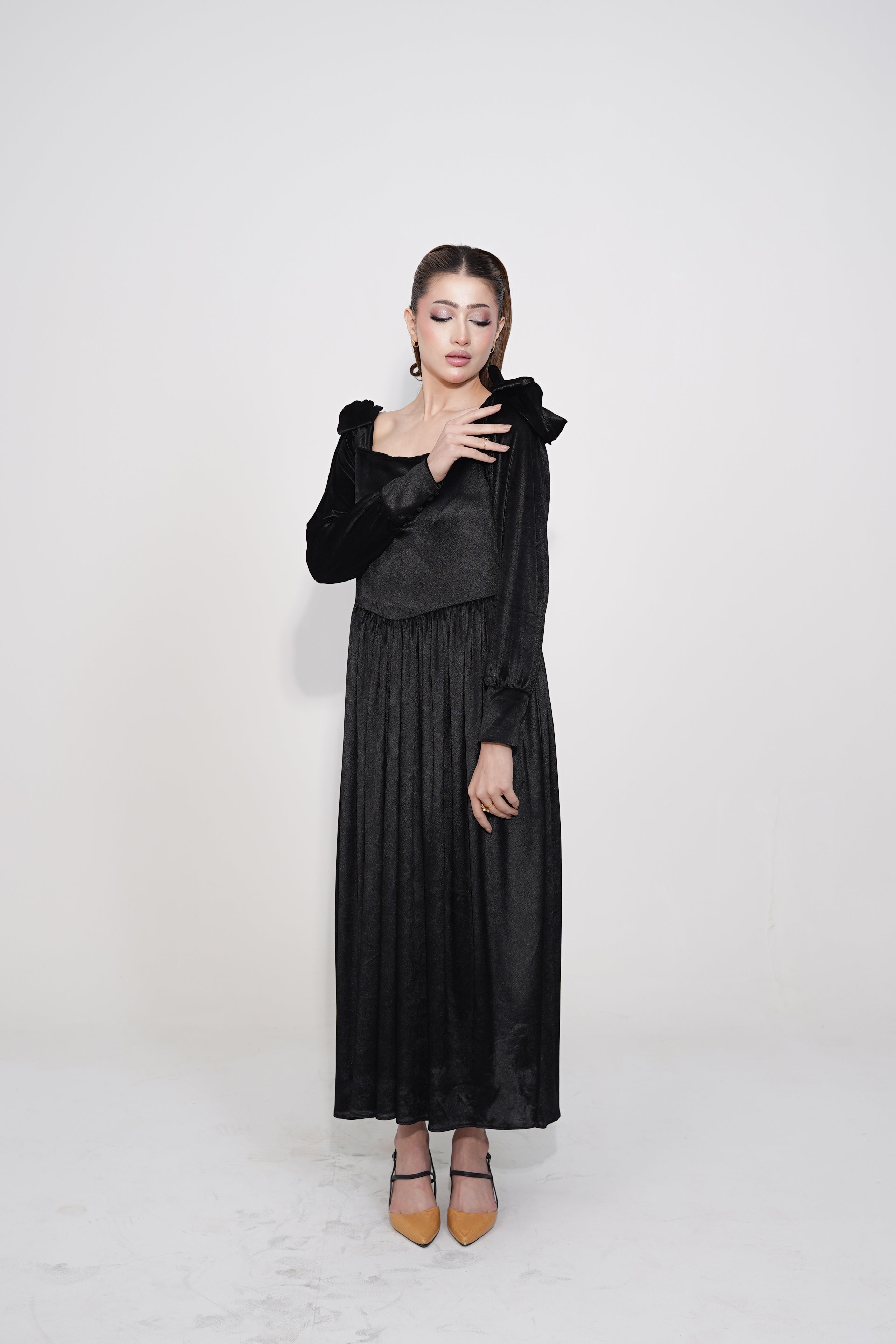 Featuring a structured square neckline, soft full sleeves, and adjustable velvet shoulder ties that can be styled into bows or left minimal—this piece allows you to customize your look with ease. The flowing A-line silhouette adds graceful movement, creating a romantic, elevated presence perfect for evenings out or special occasions.