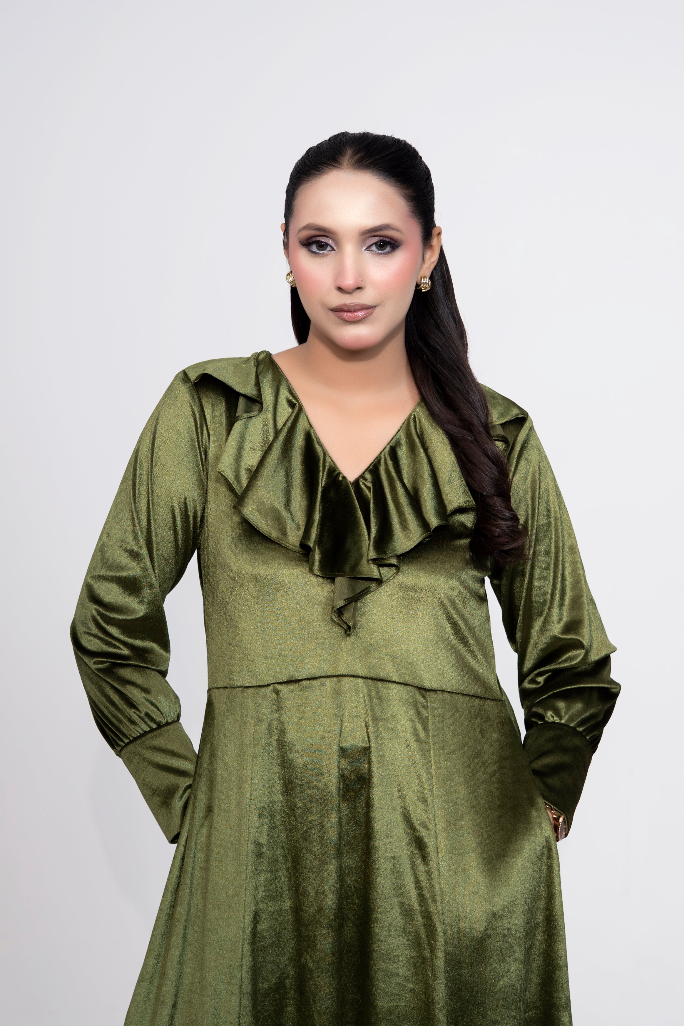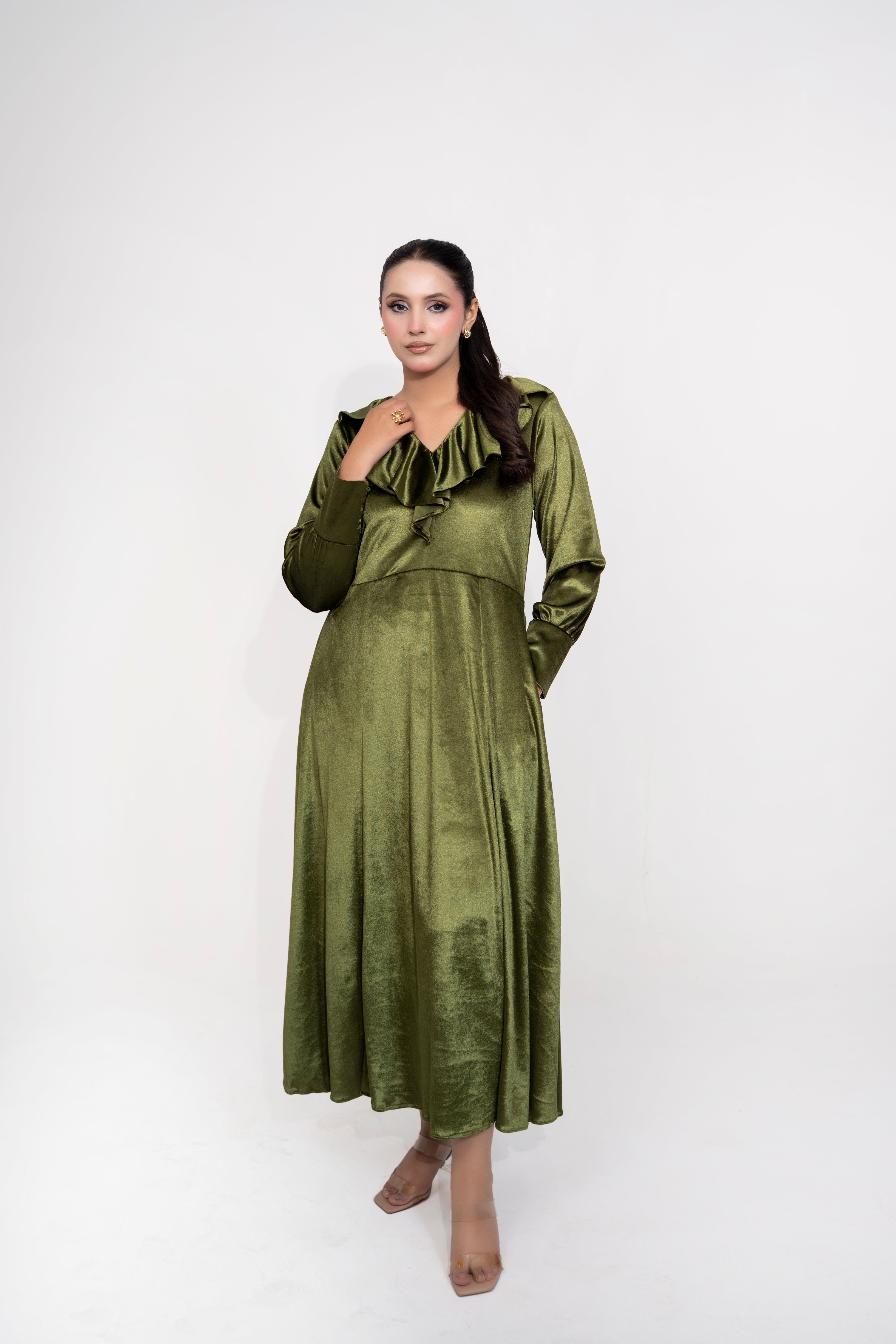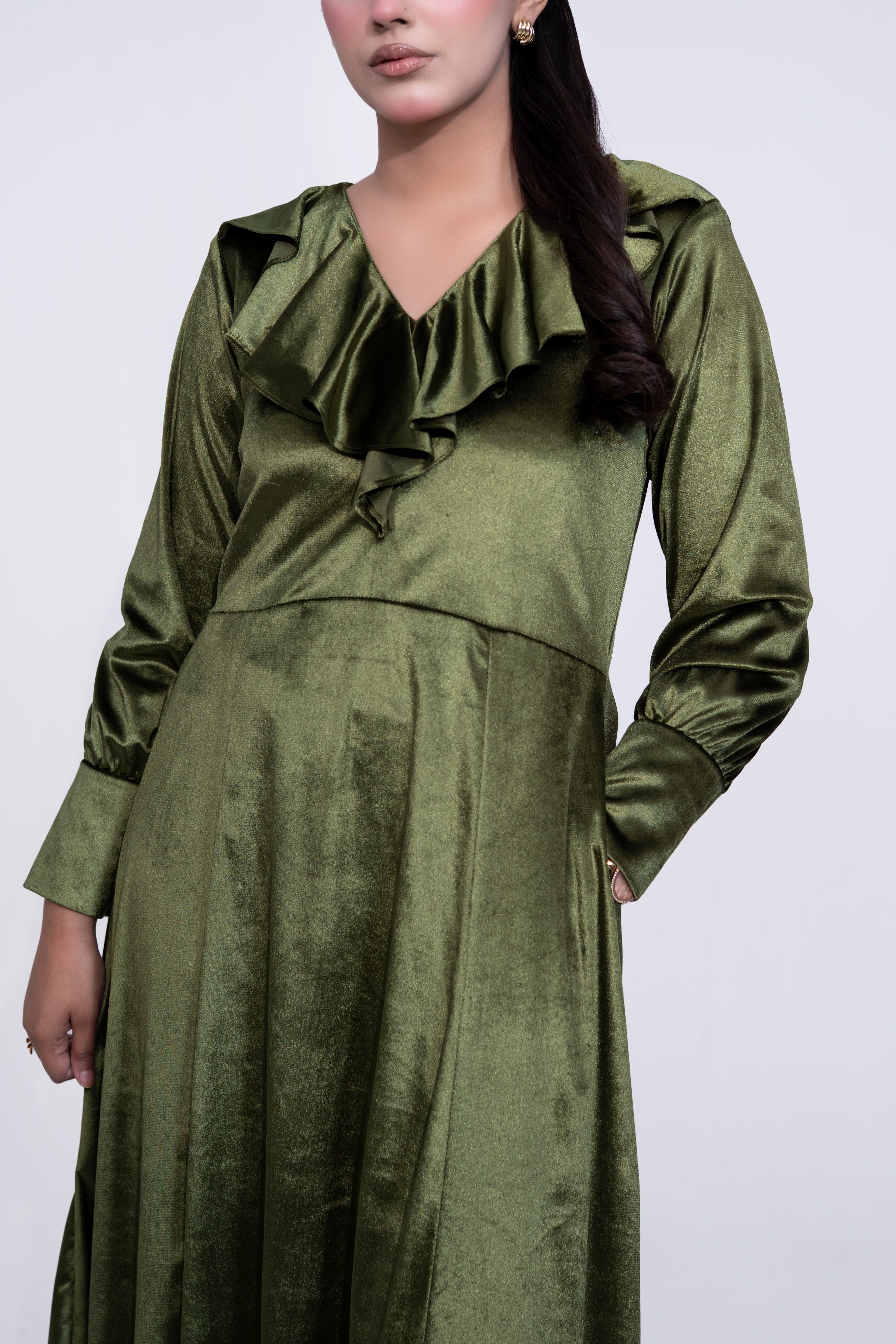 A timeless olive-green velvet dress crafted for effortless elegance.