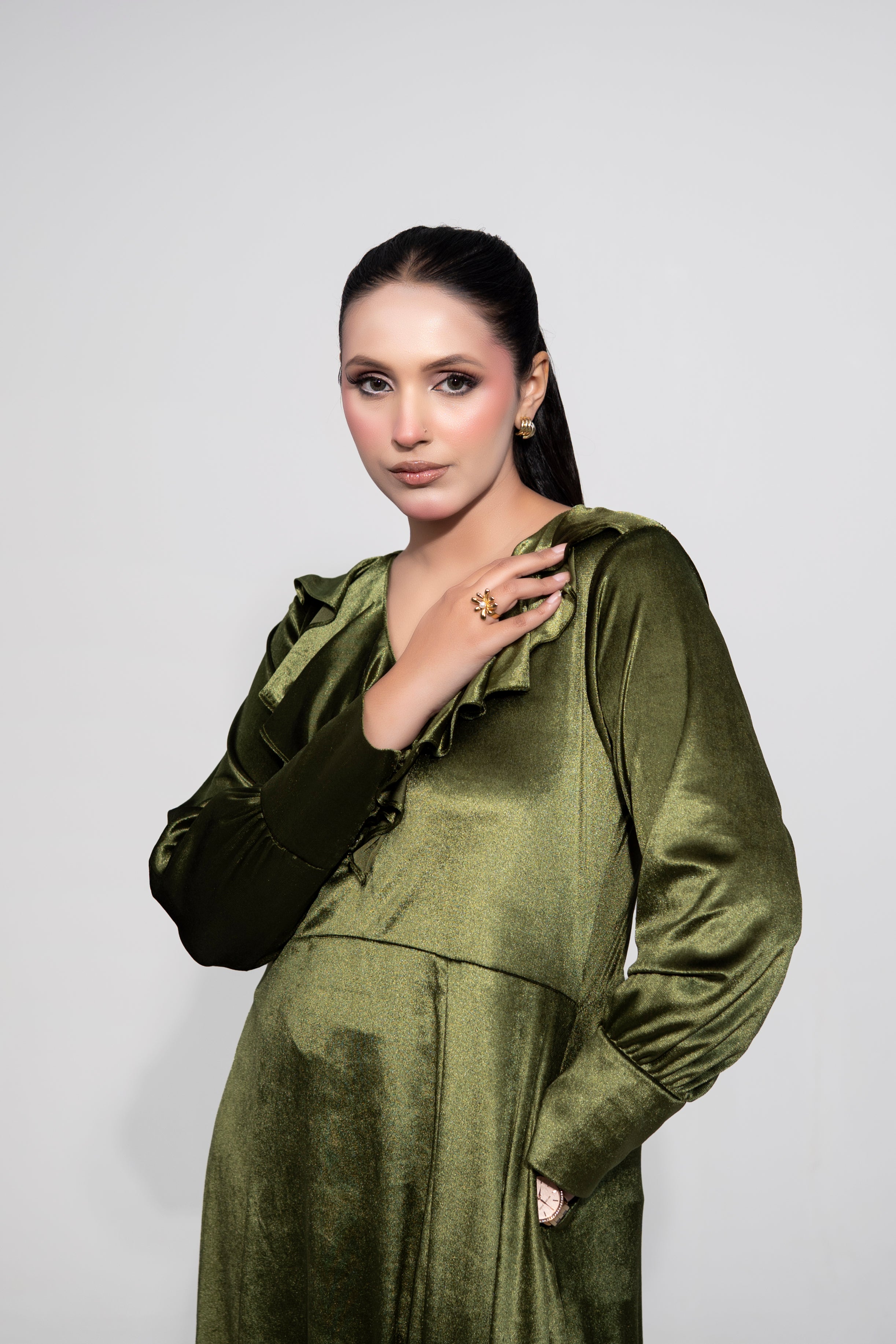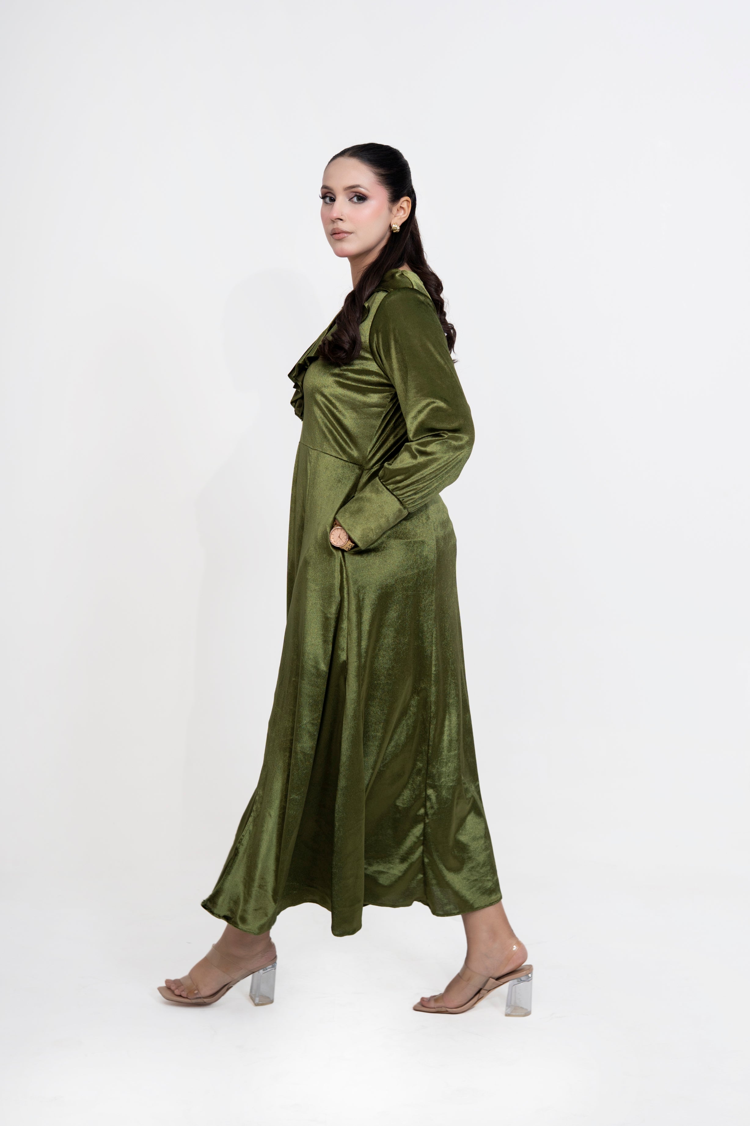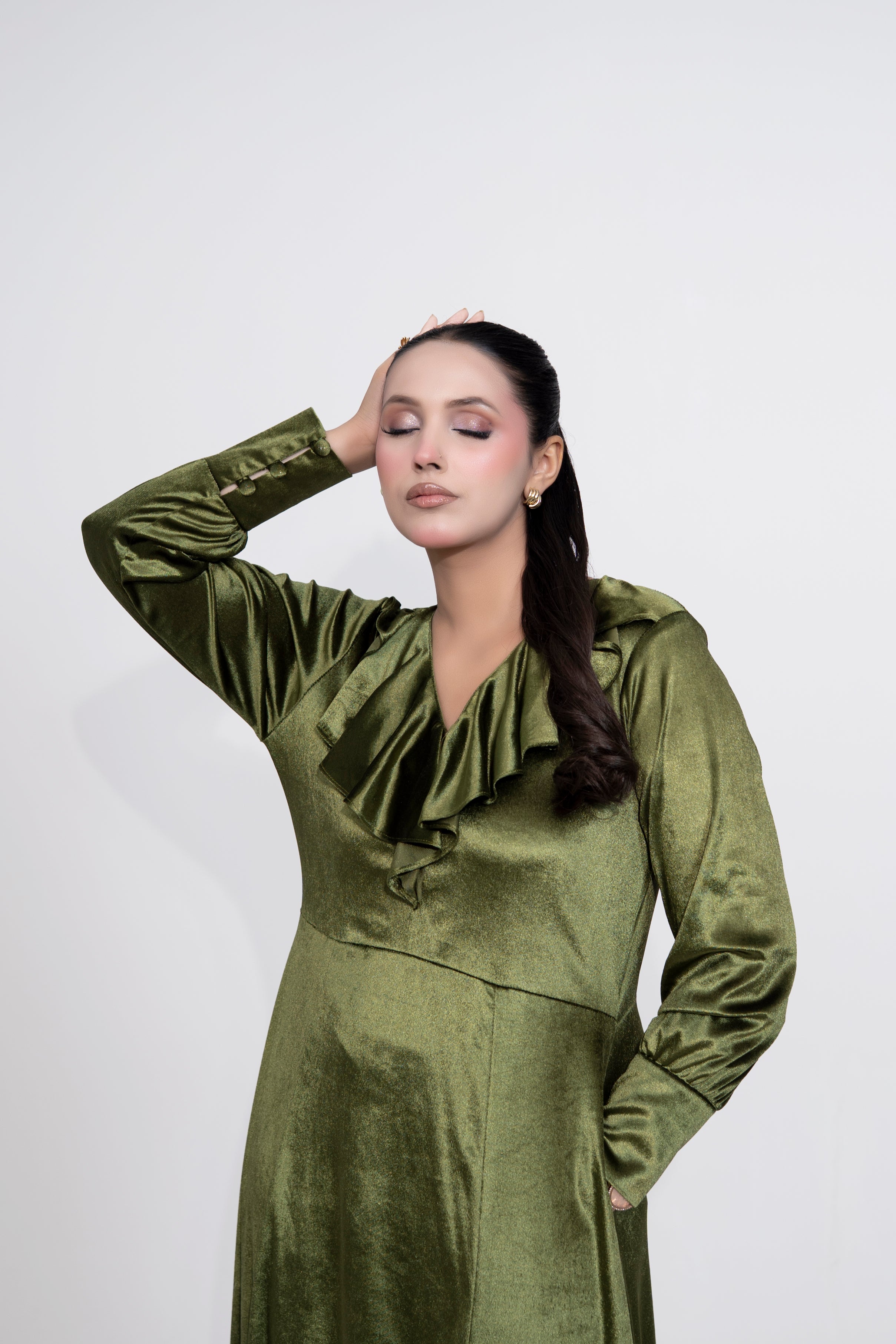 A timeless olive-green velvet dress crafted for effortless elegance.